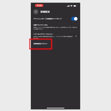 画面の中央にある「詳細設定」をタップし、「出荷時設定にリセット」をタップしてください。
